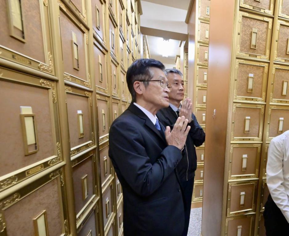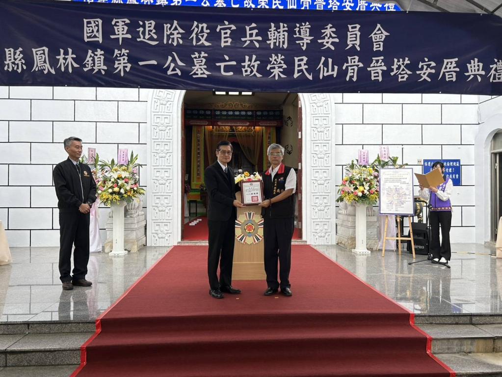 國軍退除役官兵輔導委員會主任委員嚴德發非常重視本次亡故榮民仙骨晉塔事宜,特於17日前往花蓮縣榮服處視導並與同仁進行典禮前最後整備,18日一早即前往主持典禮,由花蓮縣府、鳳林鎮公所、愛爾麗醫美集團擔任陪祭,立委傅崐萁服務處、陸軍花東防衛指揮部、空軍教育訓練暨準則發展指揮部、空軍第五戰術混合聯隊、花蓮縣後備指揮部、憲兵指揮部花蓮憲兵隊、退輔會與所屬機構等首長或代表,及榮民眷、榮欣志工與祭,藉此傳達對亡故榮民英靈無限崇敬與追思。