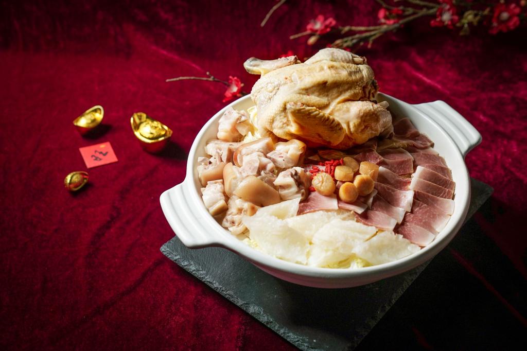 圖說:「瑤柱花膠燉全雞」,富含高膠原蛋白,滋補養顏,食材豐盛是團圓的好選擇。(台中福華提供)