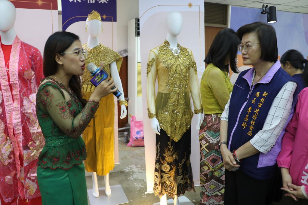 圖說:來自柬埔寨的潘喜玲為李美珍局長解說東南亞各國的服飾。