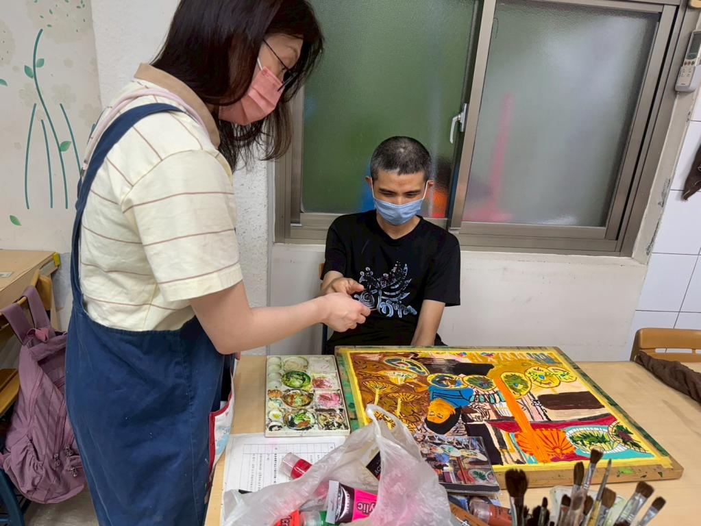 圖說:呂俞賢平時作畫的模樣 左為指導老師吳乃萱。