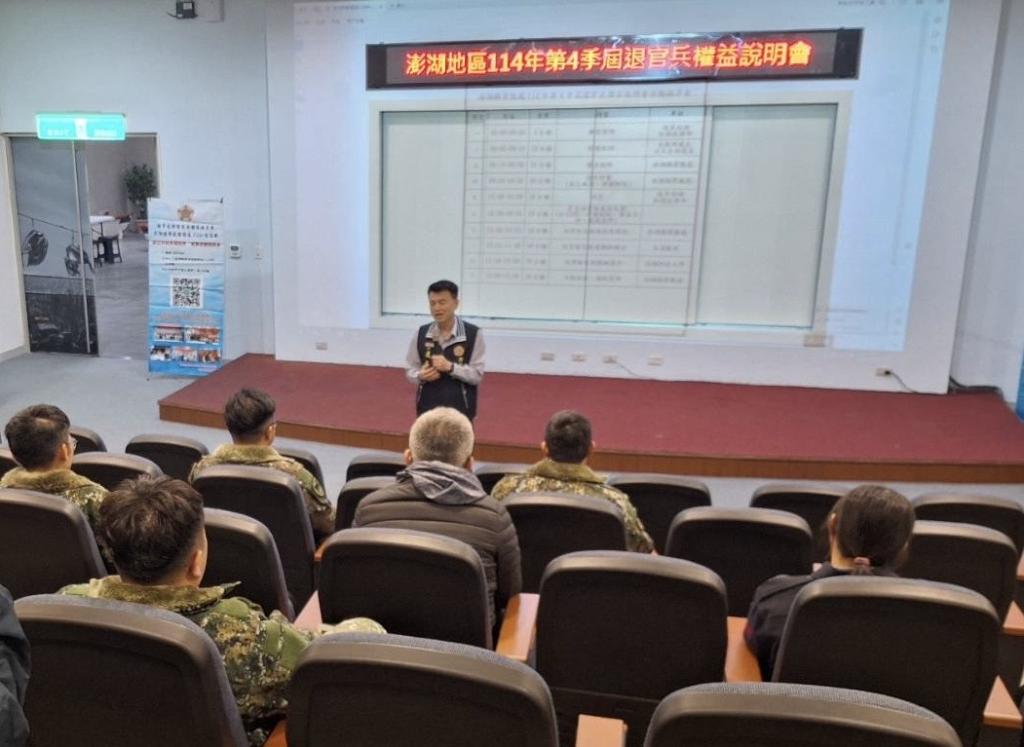【勁報記者于郁金/澎湖報導】為協助屆退官兵瞭解退伍後相關權益及輔導措施,以及早規劃職涯,順利銜接職場,27日澎湖縣榮民服務處及陸軍澎湖防衛指揮部,假澎湖生活博物館多媒體簡報室,共同舉辦114年第4季「澎湖地區屆退官兵權益說明會」;說明會由榮服處余熙明處長主持,榮服處就業站專人向與會服志願役四年以上屆退官兵,詳述其退伍後,輔導會提供各項輔導措施及權益。
