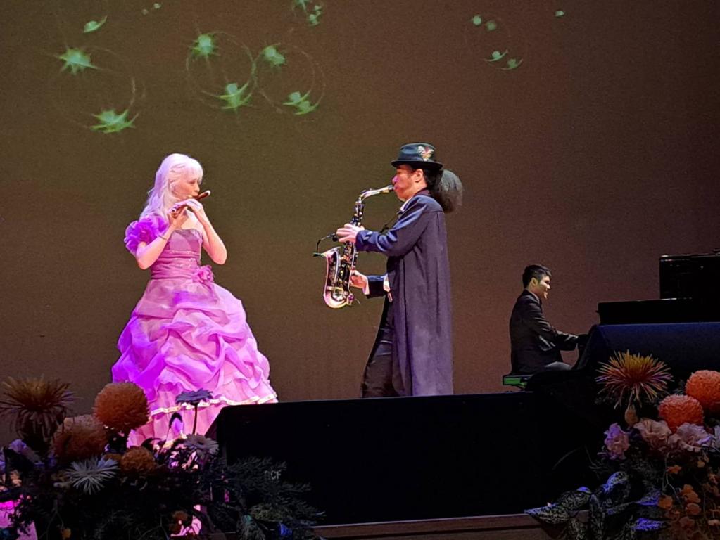 圖說:左起繆沁琳和吳柏毅吹奏生命、感恩父母等多首曲子,並合奏吳柏毅自創曲「Summer Kiss」,由電影逆光飛翔男主角黃裕翔鋼琴伴奏。