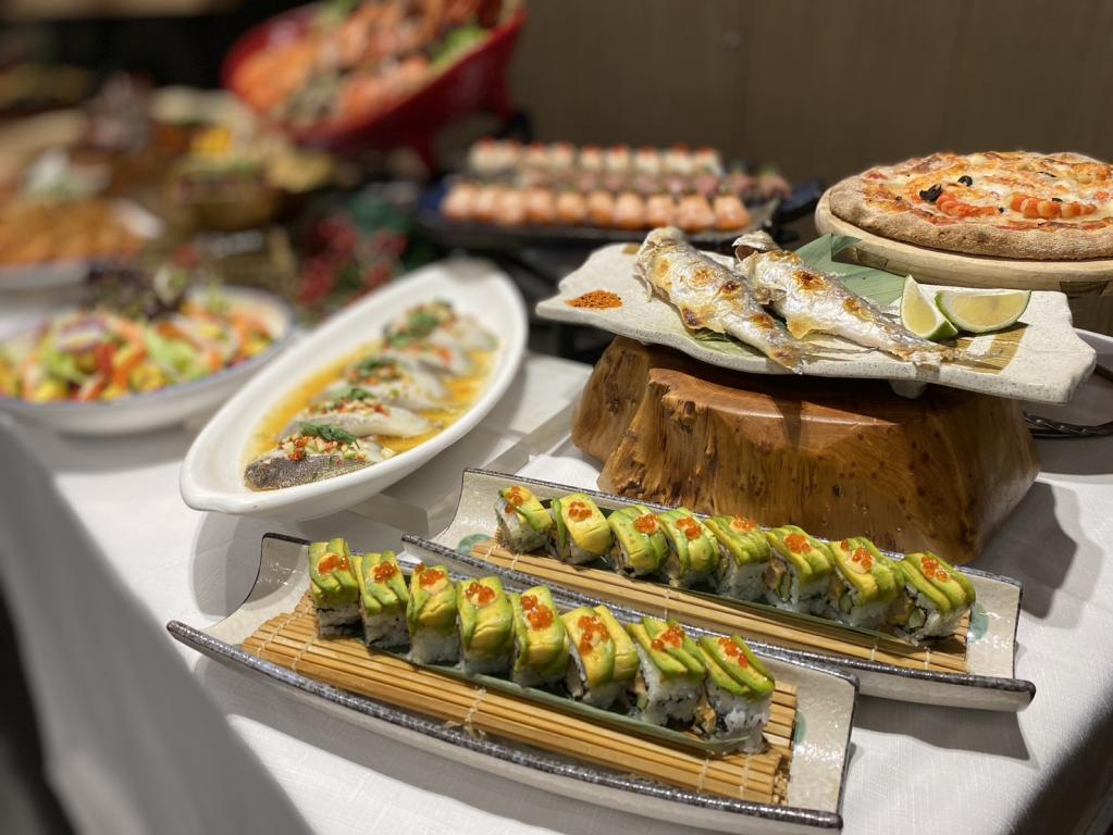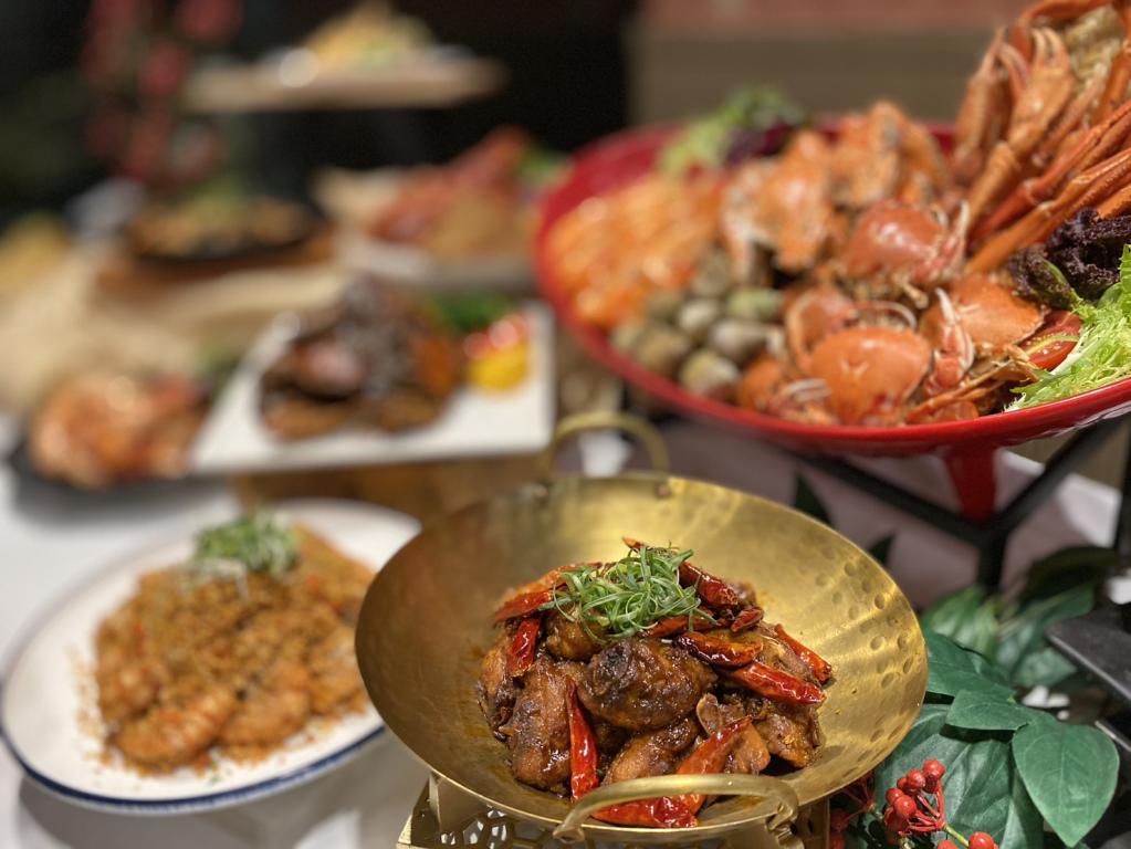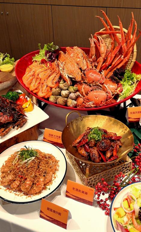 其他菜色同樣展現多國特色與濃郁海味,包括名古屋手羽先、炸蝦天婦羅、現烤午魚,以油炸與直火技法呈現鹹香;西式料理端出義式蒜味油封蝦、龍蝦干貝披薩、爐烤大蝦,以蒜油與火烤堆疊厚實風味。另有德國豬腳、新加坡黑胡椒蝦、避風塘炒蟹、老酒乾鍋雞等異國料理,讓賓客在品味海鮮之餘,也能享受不同文化的風味亮點。