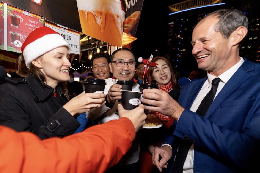 圖說:新北市市長侯友宜、德國經濟辦事處、歐洲經貿辦事處、議會團隊及市府團隊等多位貴賓齊聚進行主燈新秀暨德國耶誕市集開幕儀式,並巡攤品嚐德國道地美食與咖啡。