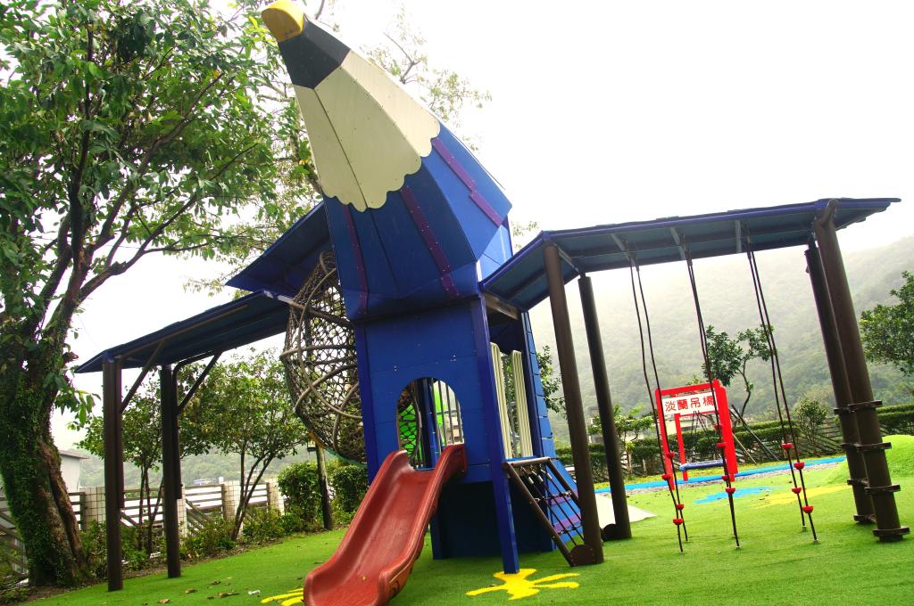 ▸ 和平國小附幼的遊戲場|以「和平之鷹、翱翔天際、展望未來」為設計主軸,完整呈現石碇在地文化。打造以大冠鷲為造型的主遊具,結合筒狀溜滑梯、攀爬網、吊樁等挑戰設施象徵乘風高飛;紅色鳥巢鞦韆象徵淡蘭吊橋,地面以小礫石鋪成石碇溪意象,更加入淡蘭古道動植物剪影。