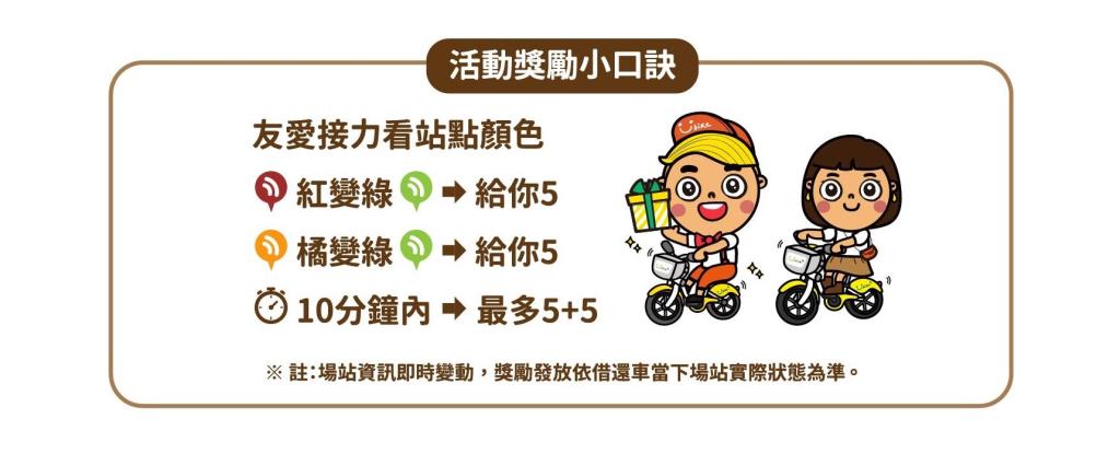 凡在北北桃3市跨站還車,以第1筆獎勵成立的還車時間起計算,一個會員帳號10分鐘內最多可獲得2次獎勵,另外,從滿站無位場站借出2.0E電輔車,因也算留一個空位給下一位使用者停放,也提供5元電子騎乘券。