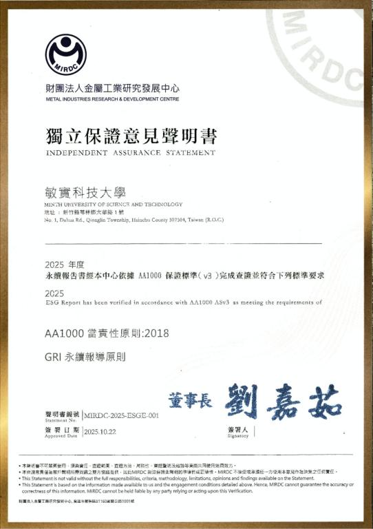 此次查證由金屬中心專業團隊執行,全面檢視敏實科大永續報告書於環境(E)、社會(S)與治理(G)三大面向之關鍵指標,包括溫室氣體排放、能源與水資源管理、廢棄物處理、教職員教育訓練、職業安全與永續治理機制等,確認其資訊揭露具備公正性、完整性與可信度,符合國際永續揭露準則。