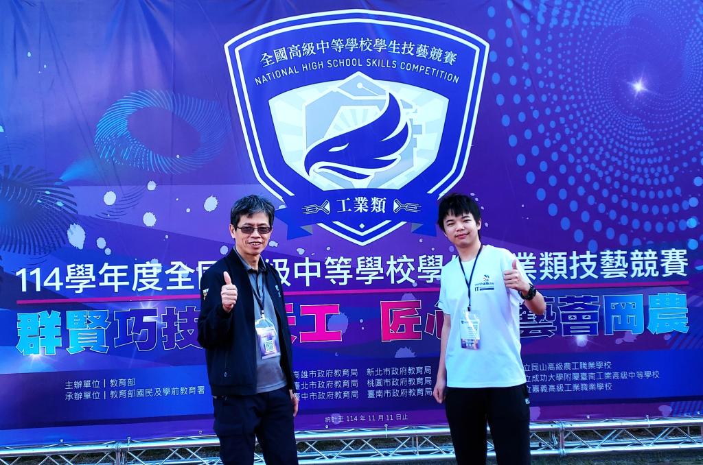 圖說:榮獲第一名的新北高工謝東霖選手與李宏傑老師合照。