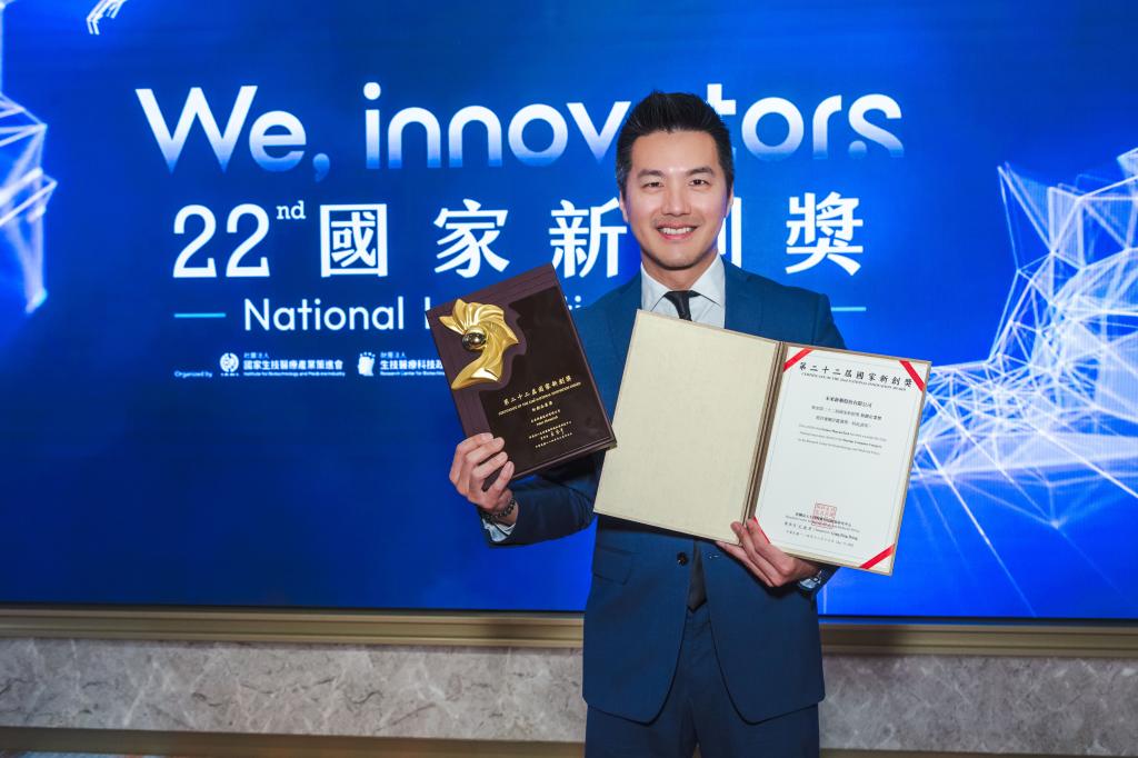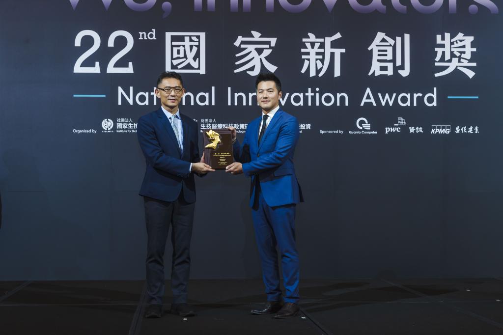 圖說:本土生技團隊榮獲第22屆「國家新創獎」,由創辦人招名威博士(右)代表領獎。