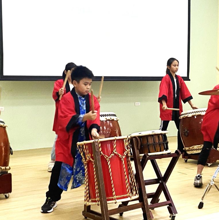 圖說:貢寮國小越南新二代林哲宇同學(左一)自信上台太鼓表演。
