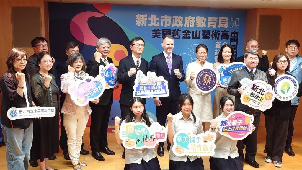 教育局長張明文表示,舊金山藝術高中通過多項美國教育機構認證,以嚴謹的學術訓練與頂尖藝術專業聞名,課程涵蓋視覺藝術、聲樂、器樂、音樂劇、芭蕾及中國舞等多元領域,長期培育學生進入全球知名藝術與設計學院。此次合作不僅是課程共享,更是將世界級藝術教育資源引進新北,讓學生在地就能與國際接軌,提早站上世界舞台。