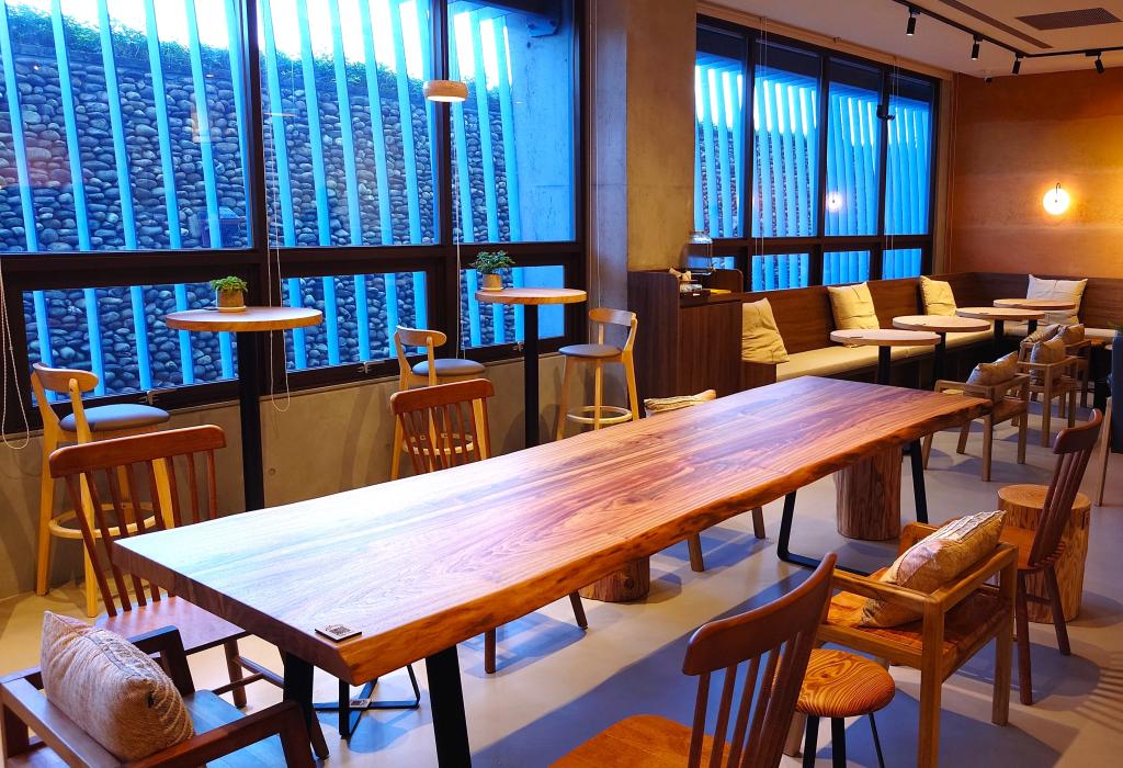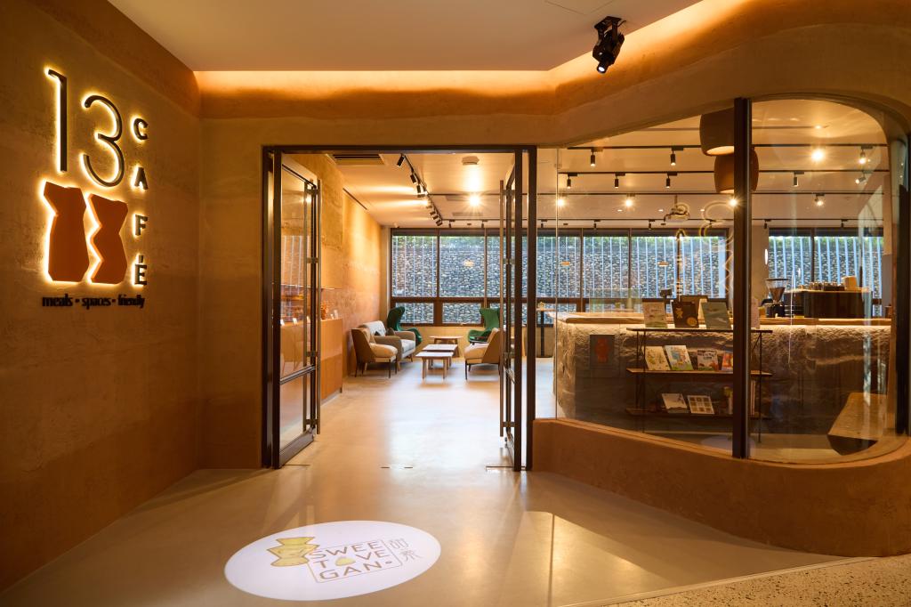「13 CAFÉ」為全臺唯一的考古主題咖啡廳,步入其中彷彿置身於史前文化層的溫潤懷抱。牆面選用在地天然塗料,以手工鏝抹出陶土般的有機肌理,將文化層肌理及考古元素融入空間裝飾,且家具嚴選具「台灣木材」標章認證的國產材及循環修枝木,具體落實愛惜森林的環保概念。