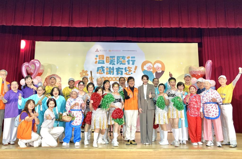▲竹市府舉辦「溫暖隨行.感謝有您」114年新竹市績優長照服務人員暨長照服務單位表揚頒獎典禮,新竹市長高虹安和開幕表演團隊一同合影。