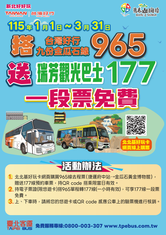 圖說:「搭965台灣好行九份金瓜石線,送177線一段票」試辦計畫自115年1月1日起至3月31日止,為期三個月。