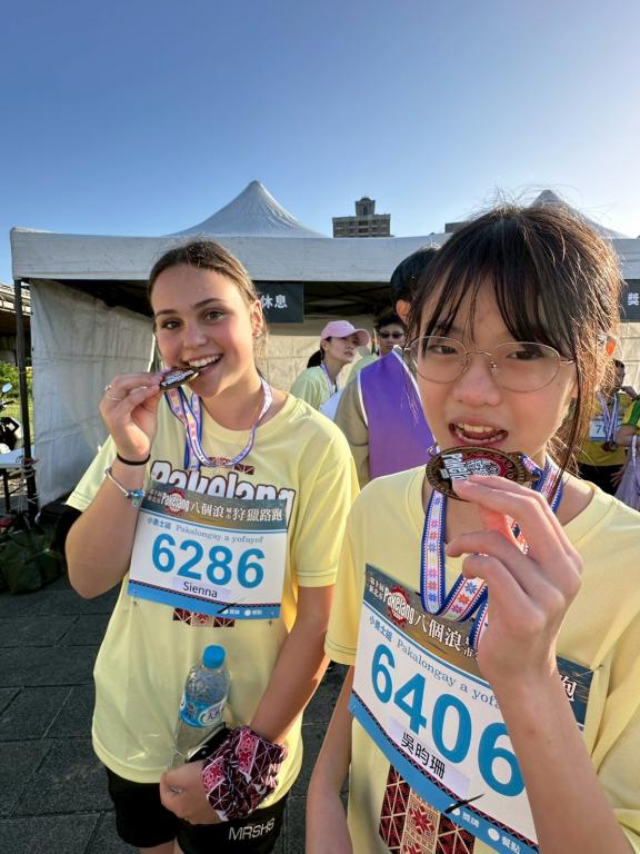 圖說:新林國小學生吳昀珊與澳洲學生 Sienna參加八個浪路跑活動,完賽獎牌。