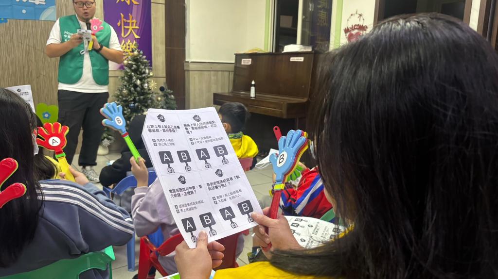 為了讓媒體識讀更貼近孩子的生活經驗,本次活動特別透過互動式體驗設計,將抽象的媒體觀念轉化為輕鬆有趣的學習過程。其中「阿嘉警犬大挑戰」以符合國小孩童理解程度的題目出發,透過即時作答與舉牌互動,引導孩子思考日常中可能接觸到的資訊情境,讓學習在遊戲中自然發生。