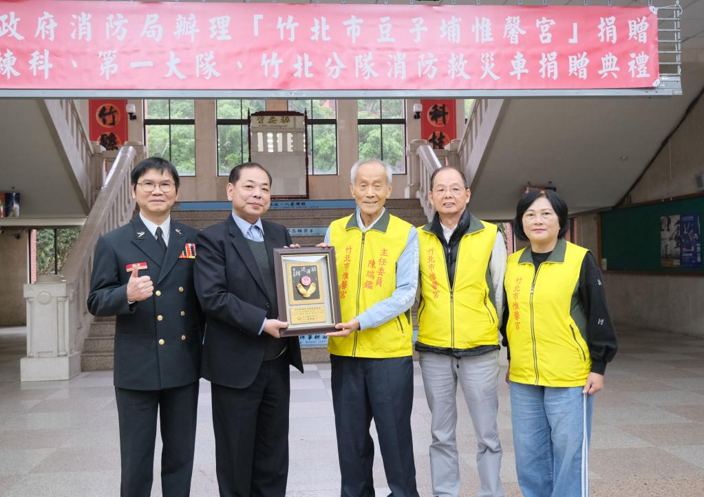 竹北市豆子埔惟馨宮深感消防人員執行救災任務時面臨安全及效率挑戰,現任主委陳瑞鑑先生與廟方委員們共同討論下,決定集結信眾愛心,捐贈價值共310萬元的三輛全新消防車輛,今(26日)於新竹縣政府大廳舉行捐贈儀式,由新竹縣副縣長陳見賢代表受贈,並回贈感謝紀念品,表達對惟馨宮的肯定,期望協助提升消防同仁執行各項消防勤務之品質、效率及安全,保障縣民生命安全。