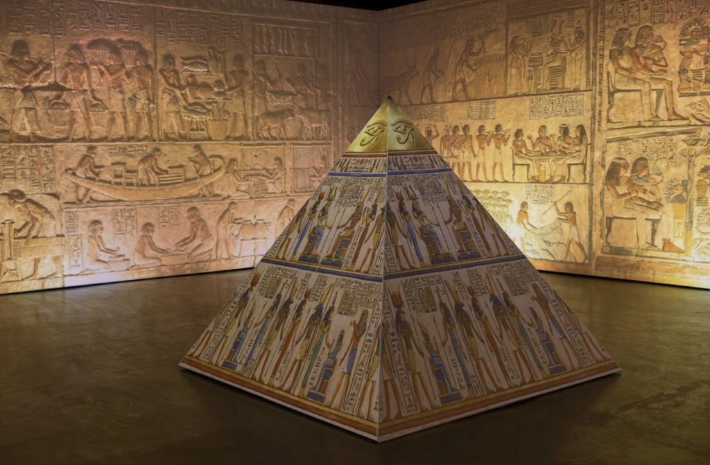 沉浸式木乃伊陵寢造景結合金字塔立體投影,打造古埃及獨有的永恆視覺語彙。復刻文物呈現神祇、信仰與再生概念,帶出埃及文明從死亡走向永恆的世界觀。