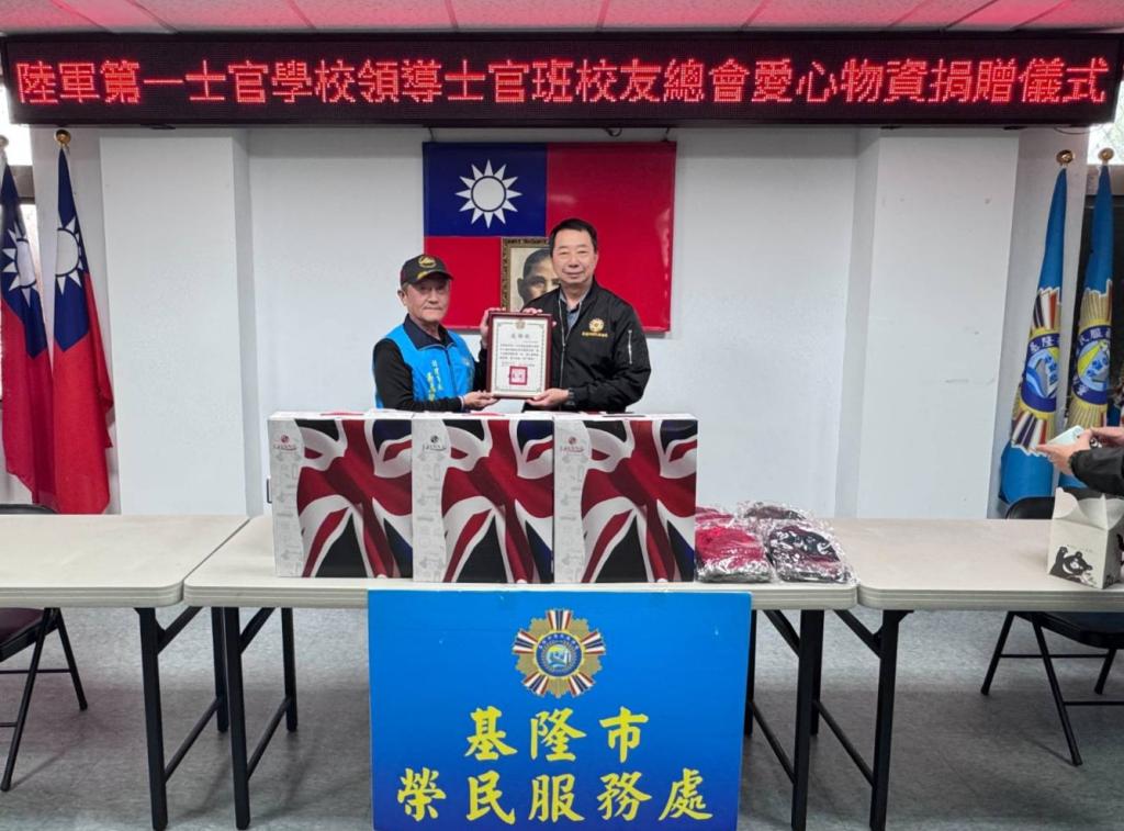 吳理事長致詞表示,陸軍第一士官學校領導士官班校友總會很高興來到基隆捐贈物資給榮民眷,表達校友總會關懷;該會成立目的係基於對軍中同袍情誼,並回饋社會,希望在寒冬前,由校友總會準備溫暖便攜毛毯,能帶給基隆榮服處轄區內榮民眷溫暖。