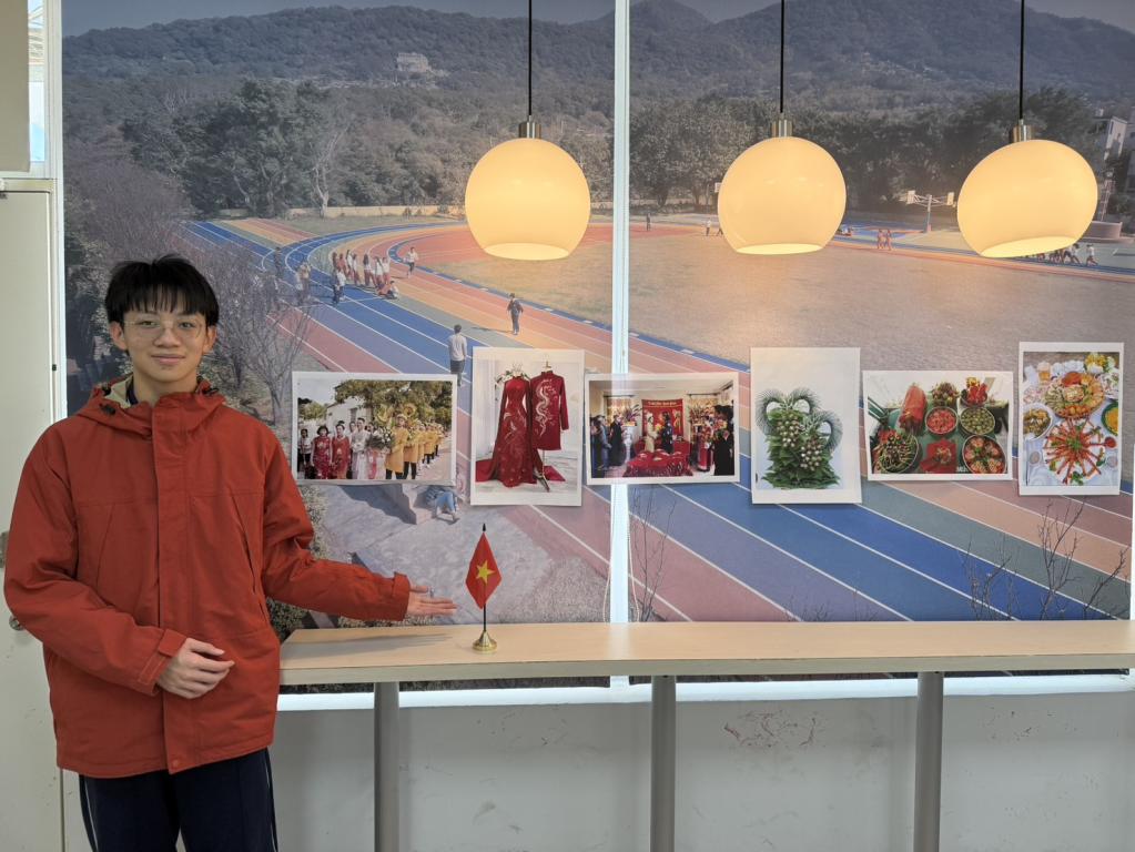 來自八里國中八年級的蔡守濠,學習越南語長達6年,已能與越南人流暢對談。他在比賽中分享與家人參加「臺越跨國婚禮」的深刻經驗,從新娘身著越南傳統服飾「奧黛」、莊重的祭祖儀式,到象徵夫妻永恆的聘禮「檳榔與荖葉」,對比臺灣常見的黃金戒指與項鍊,讓聽眾看見文化差異背後共同的情感價值。他表示,這場婚禮讓他真切體會到「文化雖不同,愛卻沒有國界」。