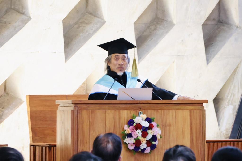 圖說:張國恩校長指出獲頒東海大學名譽博士必須同時具備學術地位、獲獎成就、產業貢獻及社會影響力四大條件。(東海大學提供)