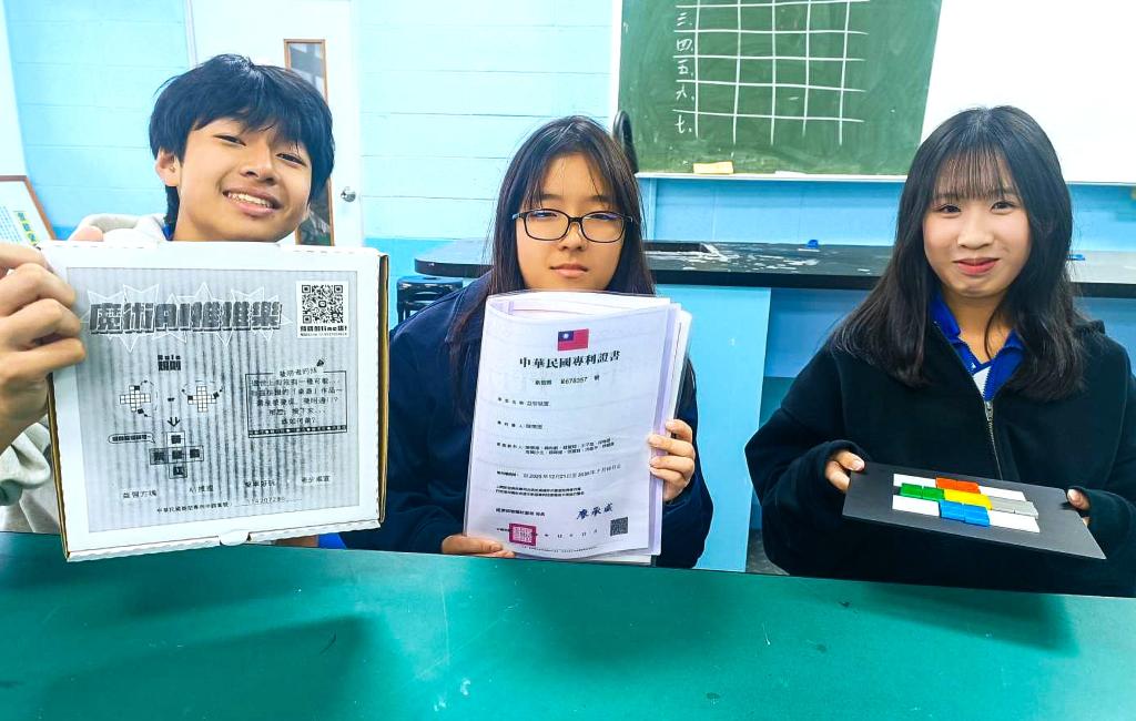 圖說:光仁中學學生發明魔術推推樂益智遊戲開心呈現專利及作品原型。