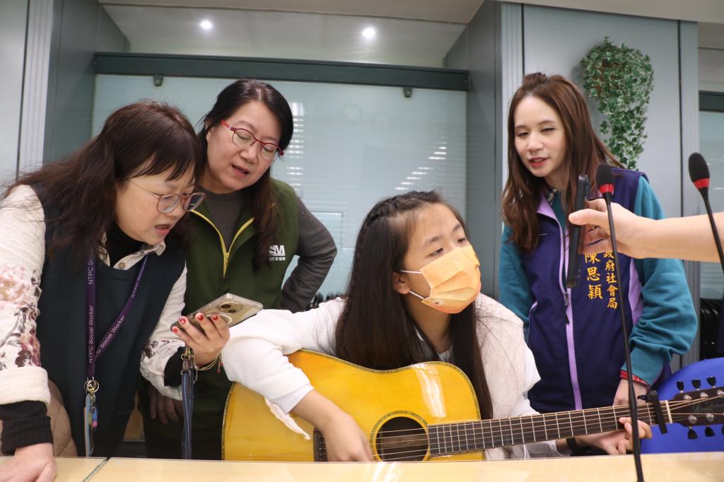 圖說:小亭自彈自唱五月天的「知足」和「突然好想你」,希望藉由歌聲表達對所有幫助過的人的感謝。左2為安置機構院長蘇鈺惠。