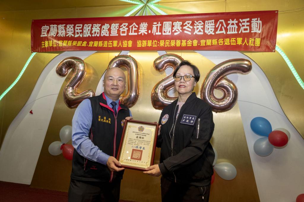 宜蘭榮服處僅代表宜縣內榮民眷等,以一楨感謝狀,致上最高敬意及謝意;貴賓們亦紛紛向在場榮民(眷)賀年並致感謝之意,讓在場榮民(眷)感到無比尊崇與感動不已,為這次感恩活動,留下溫馨圓滿句點。(于郁金翻攝/宜蘭縣榮民服務處提供照片)