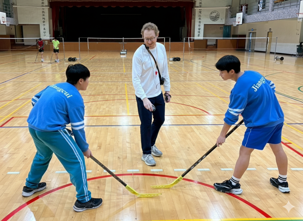 圖說:江翠國中外師帶領學生體驗曲棍球活動。