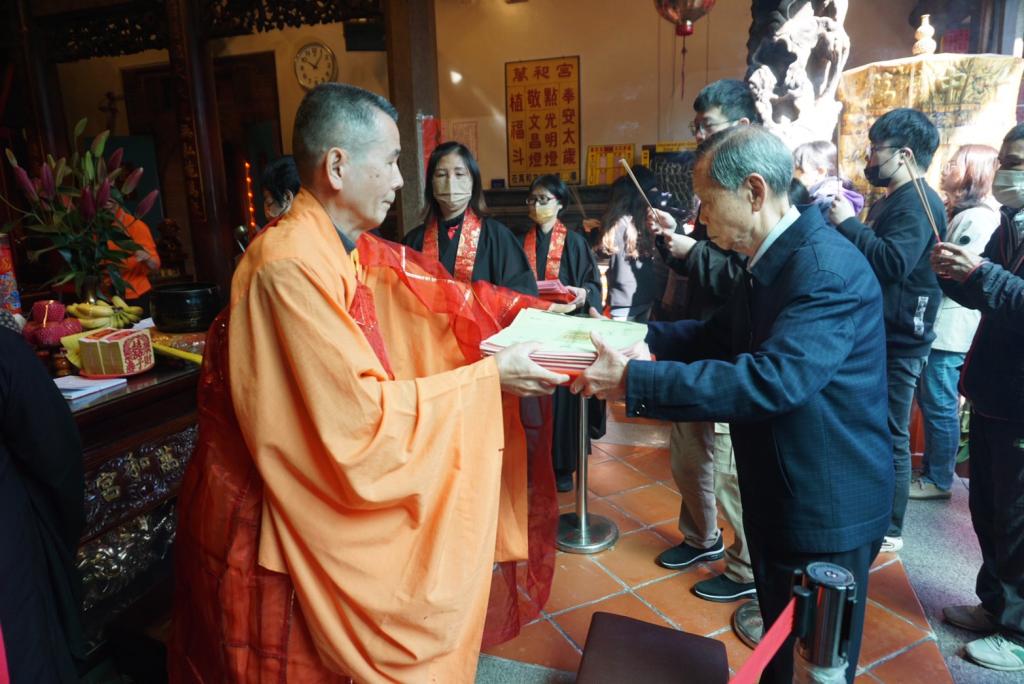 圖說:萬和宮謝斗法會,蕭清杰董事長敬獻文疏。(中市萬和宮提供)