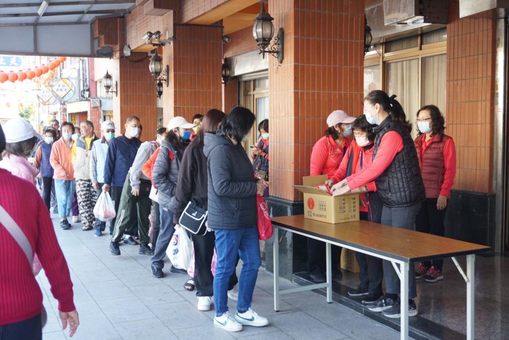 圖說:萬和宮謝斗法會贈送平安夀麵,信眾依序排隊領取。(中市萬和宮提供)