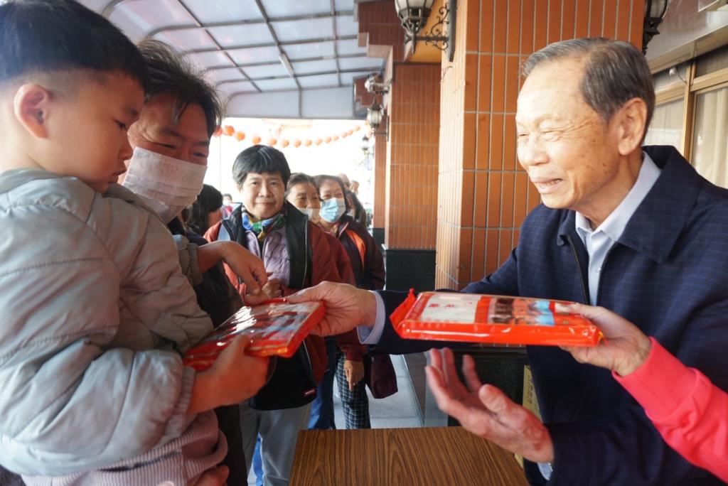 圖說:萬和宮謝斗法會,董事長蕭清杰贈送信眾夀麵,小朋友開心取。(中市萬和宮提供)
