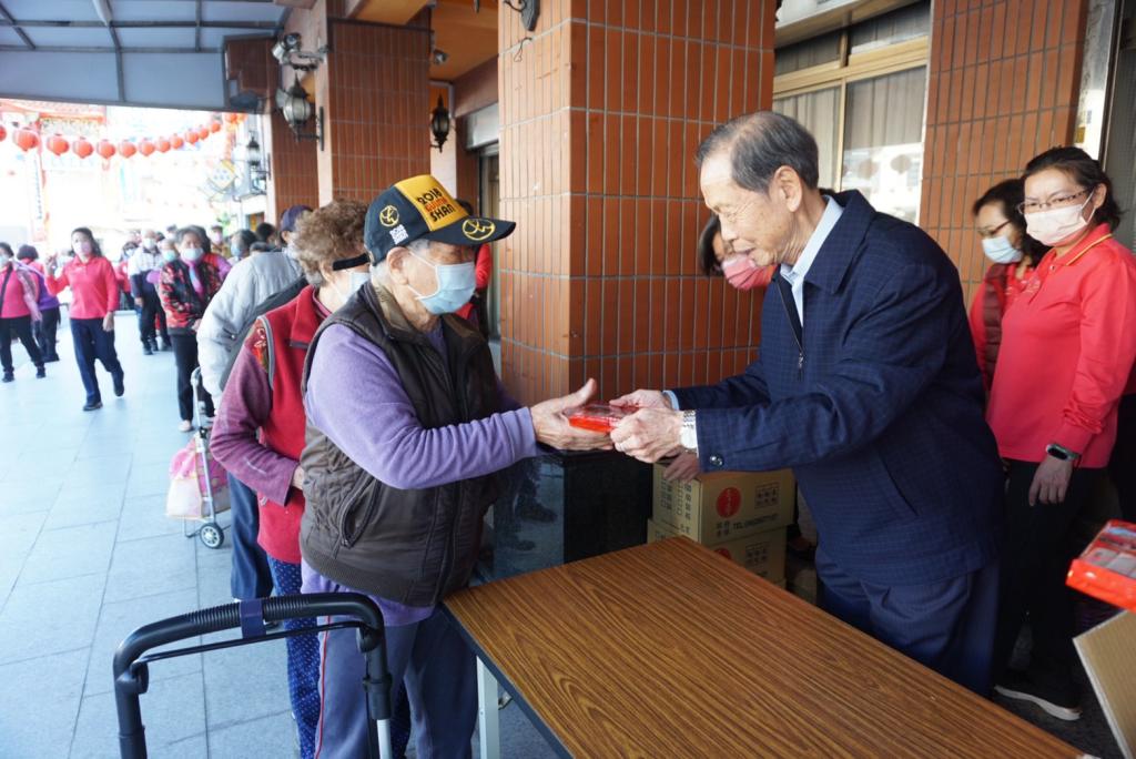 圖說:萬和宮謝斗法會,董事長蕭清杰贈送信眾夀麵。(中市萬和宮提供)