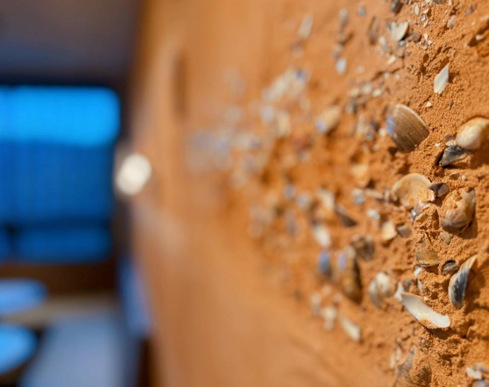 圖說:牆面選用苗栗黃土與桃園紅土混入文蛤殼與陶片,手工鏝抹出文化層肌理。