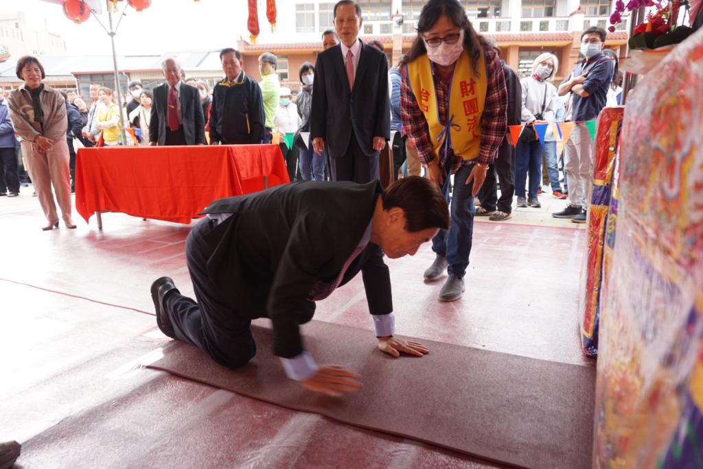 常務監事簡萬水,率先示範踜轎腳的步驟,信眾依序雙手合十,彎下身子,從轎腳爬過。不分男女老少,每人虔誠的心情都寫在臉上。有的小朋友特別俐落,快速爬過,一些較年長的信眾,在志工們關注與扶持下,緩緩起身。自由捐添油香的信眾,獲贈一份媽祖平安吊飾。