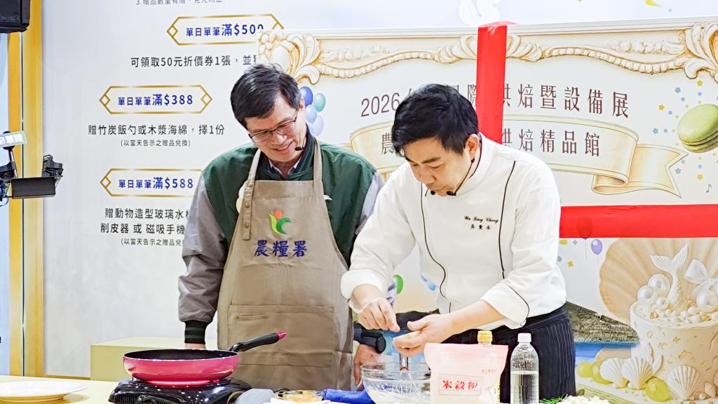 展館中將展示多款以國產米穀粉與雜糧製作的創新食品,包括口感Q彈的米麵、香酥烘焙點心、米蛋糕及創意穀物零食等,也有結合不同穀物與烘焙技術製作的伴手禮與即食食品,呈現國產米穀雜糧在甜點、主食與零食等多元產品型態中的創新應用。展覽期間並安排料理示範與舞台活動,分享米穀粉在烘焙與料理中的創意應用,讓國產米糧融入日常飲食生活。此外,展館也推出多項消費優惠活動,於館內消費滿500元即可獲得50元折價券;滿388元、588元、1,880元及2,880元可兌換竹炭飯勺、造型玻璃水杯、折疊收納推車與旅行登機箱等滿額贈品,數量有限、送完為止。