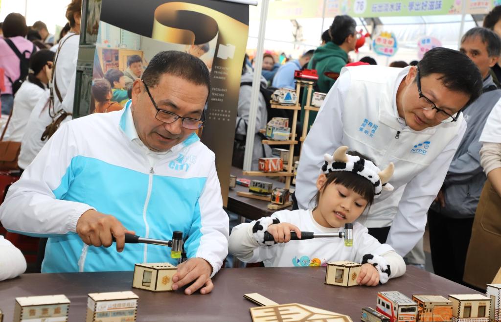 圖說:市長侯友宜(左)及教育局長張明文(右)到山佳國小進行火車模型組裝體驗。