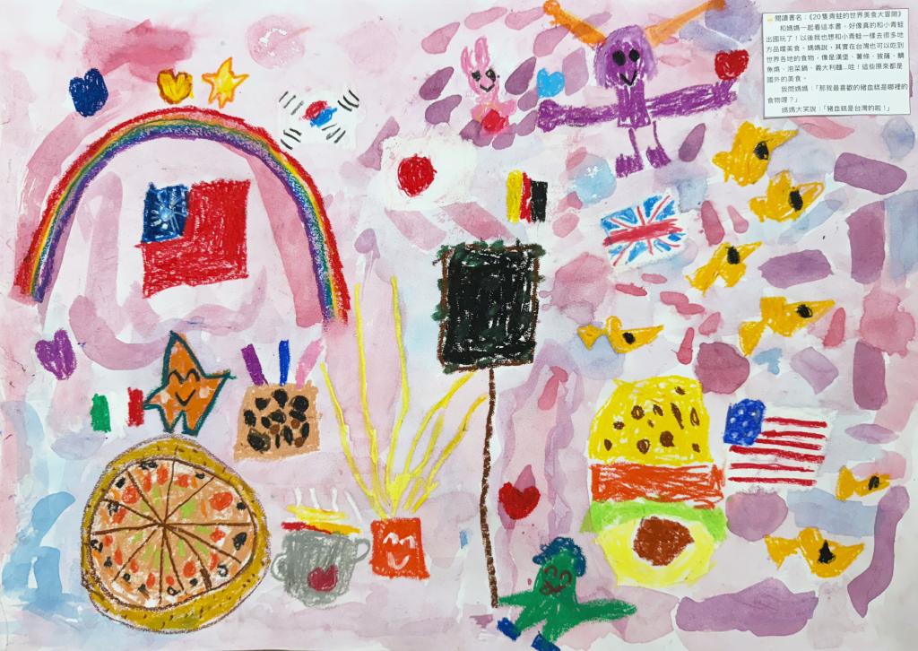 在幼兒園組方面,特優得主鄭裔霏與媽媽共讀《20隻青蛙的世界美食大冒險》,從世界各國料理主題探索不同文化特色。孩子將各國美食元素融入畫作,也在分享過程中發現,自己最喜歡的豬血糕正是極具代表性的臺灣特色美食。親子共讀不僅讓孩子認識世界,也讓文化理解在生活經驗中自然萌芽。