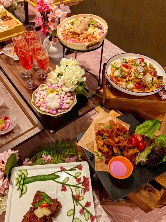 星饗道國際自助餐以「桜の饗宴:粉色食驗室」為主題,運用日本鹽漬櫻花入菜,從前菜到熱食皆洋溢春日氣息。包含櫻花最中餅、櫻花壽司、櫻花冷細麵與櫻花洛神篿菜醋等多道春季限定料理;熱食則推出櫻花鮭魚炊飯與櫻花春筍蒸鮮魚,層層堆疊春日風味。