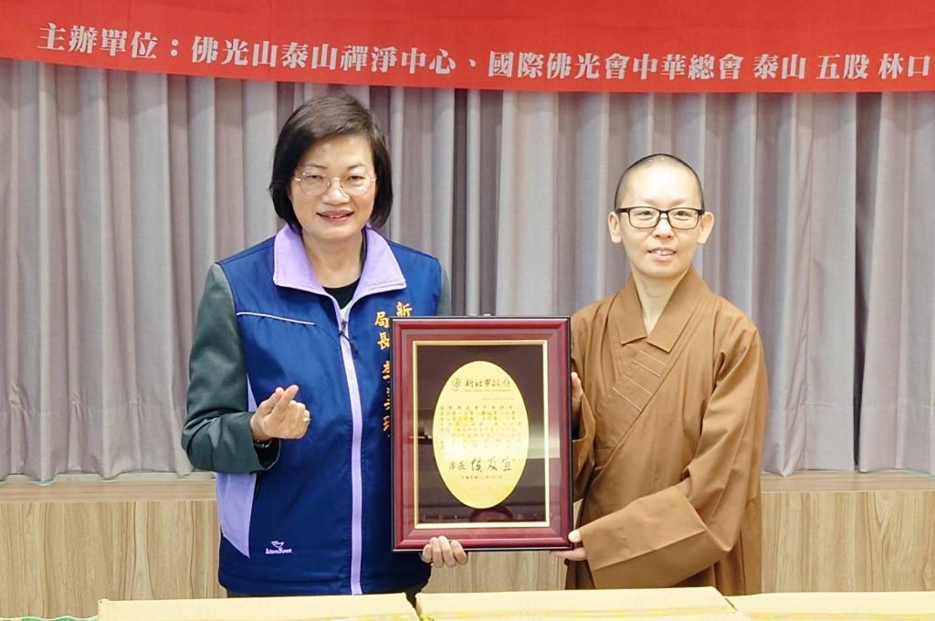 圖說:社會局長李美珍(左)代表侯友宜市長致贈感謝牌給佛光山泰山禪淨中心如遠法師(右)。