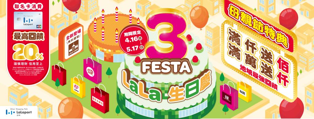 母親節適逢 LaLaport 台中三歲生日慶,全館好康絕對是加倍放大!期間全館推出「3 Festa LaLa 生日慶」檔期,「滿千送百」回饋率最高15%,並可無上限累贈!活動共有兩波段: