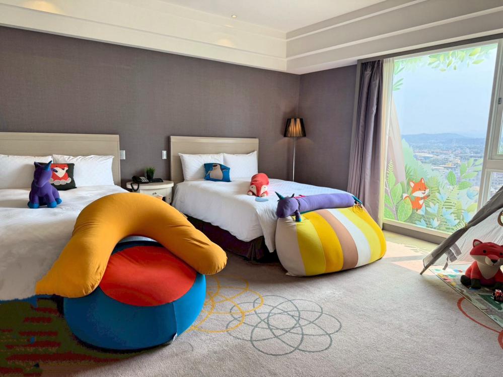 ▲新竹老爺攜手yogibu懶骨頭推出期間限定「森林小聚」限量親子房。圖係新竹老爺豪華家庭客房寬敞舒適,提供懶骨頭外還有小帳蓬供親子玩樂。(圖/新竹老爺提供)