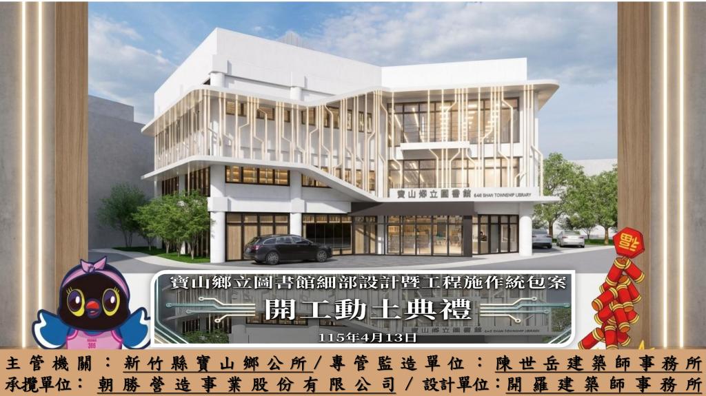 竹縣寶山文化新地標!為提升在地閱讀環境並落實文教建設之永續發展,新竹縣寶山鄉公所於今(4/13)日上午9時30分,盛大舉行「新竹縣寶山鄉立圖書館館舍裝修工程規劃設計暨工程施作統包案」開工動土典禮。在中央與地方官員及多位貴賓共同見證下,祈求工程平安順利,象徵寶山鄉正式邁向智慧閱讀與客家美學結合的新里程碑。