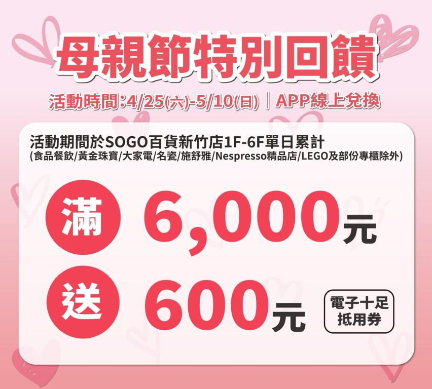 新竹SOGO店長祝平政表示:「今年母親節檔期已不只是節慶消費,而是上半年家庭支出規劃的重要節點。新竹SOGO啟動多重回饋,讓顧客可以在價格相對穩定的時期完成關鍵採購。」,推出扣快樂購點數200點換100元購物金,每人可換5張,限量1萬張,4月17日11點SOGO APP線上開搶;百貨服飾單日累計滿6,000元送600元、大家電單筆滿10,000元送1,000元、珠寶/名瓷/施舒雅/冷氣空調單筆滿10,000元送500元。