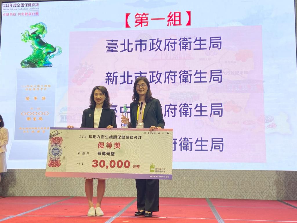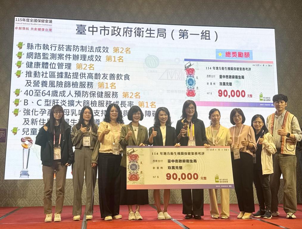 圖說:臺中市政府衛生局榮獲國民健康署114年地方衛生機關保健業務考評第一組優等獎。(中市府衛生局提供)