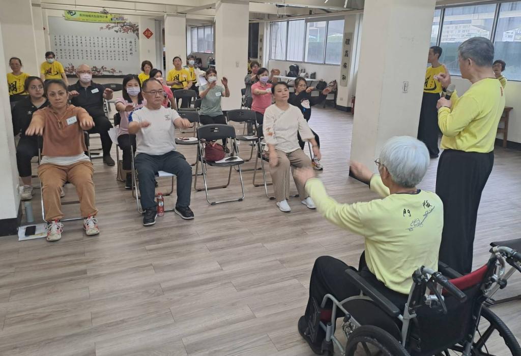 圖說:梅門師兄李志恆培訓長照機構負責人示範教導如何讓坐輪椅者也可以運用上肢平甩,以改善身心健康。