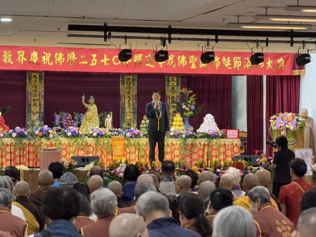 (勁報記者胡光輝/新北報導)慶祝佛曆2570年釋迦牟尼佛聖誕,新北市佛教會今(19)日邀集各界僧眾於三重綜合體育館隆重舉行「浴佛節慶典大會」,副市長朱惕之上午特別前往會場浴佛,與現場千位僧眾及信徒,在莊嚴梵唄聲中,共同祈求佛光普照、社會祥和、國泰民安、四時無災。