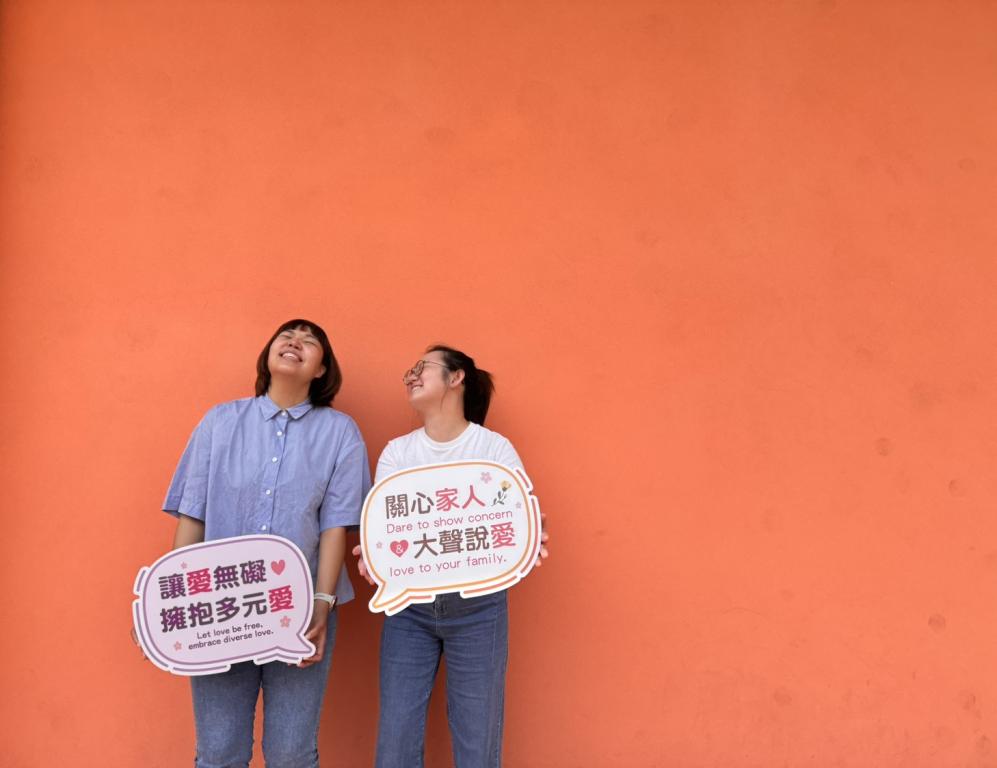 圖說:新北家防中心同仁高舉「讓愛無礙 擁抱多元愛」及「關心家人 大聲說愛」手舉牌,呼籲大家穿著或行為都是多元表達的方式,把理解與尊重帶進日常生活中。