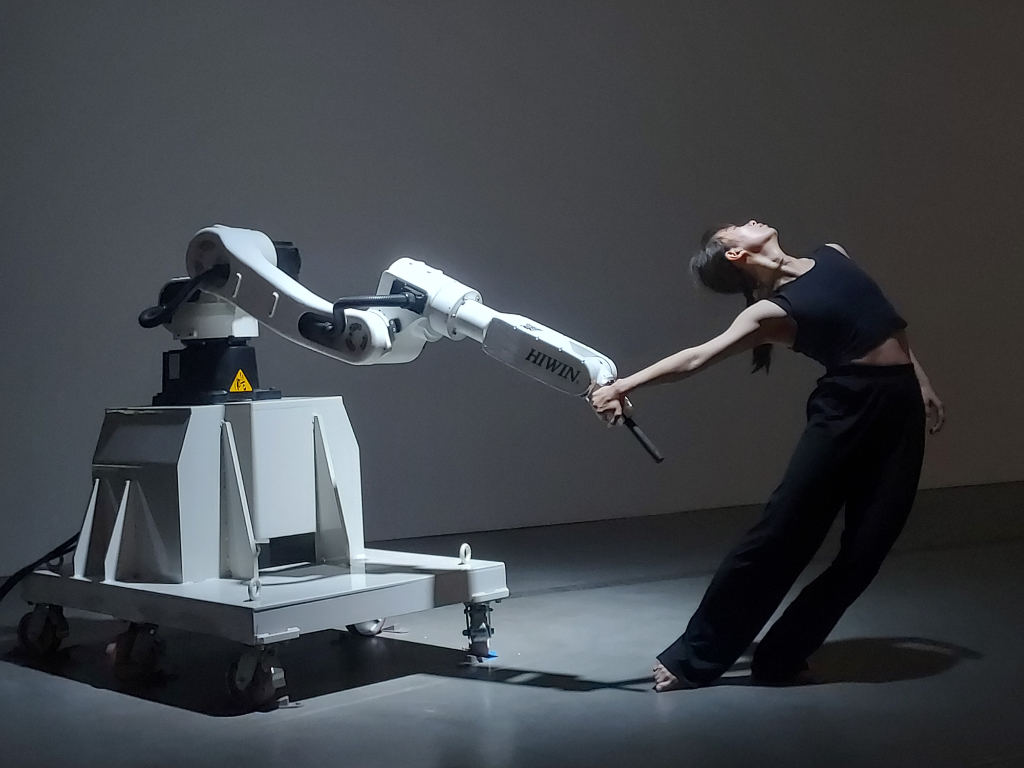 「人機共舞」這次獲獎強調「直覺性的科技介入」,及「零編程的藝術創作」兩個重點,旨在實現直覺化零編程機械手臂控制,讓藝術家能以身體語言與機械手臂共同創作;研究對應兩個重點開發出鏡像模式與教導模式兩種主要流程,鏡像模式(Online)強調人的肢體便是最好互動語言,透過電腦視覺即時姿態感知,及正向運動學對應機械手臂六軸資料轉譯,使得機械手臂能同步模仿舞者動作,實現機械手臂即興伴舞人機互動;教導模式(Offline)則強調以自然肢體語言進行人機協作潛力,同樣以電腦視覺辨識舞者跳舞時骨架,並將其轉換成類似關鍵影格動作節點,隨後機械手臂便能自動透過AI學習串連這些節點形成流暢舞蹈動作,就像是舞者老師用肢體語言在教導機械手臂跳舞一般,過程中完全不寫程式,讓藝術家可以零編程完成人機共舞編舞創作。