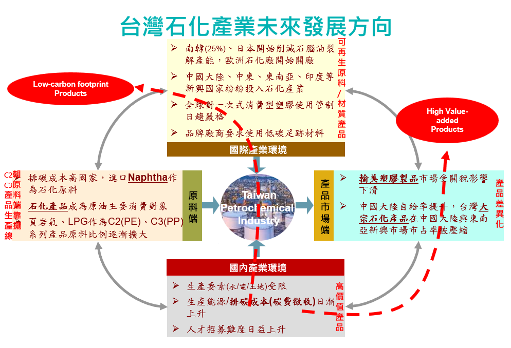 延續上述挑戰,工研院強調,國際政經局勢的快速變化也加深台灣石化產業的壓力。例如,中國大陸多項石化品產能快速擴增,造成亞洲與全球石化供需市場失衡;美國關稅的不確定性也干擾全球化學品貿易;歐洲化學品生產深陷原料與能源競爭力低落狀態。同時,台灣製造業也正面臨中國大陸可能全面中止ECFA、全球塑膠公約限制生產的不確定性,以及碳費對台灣與國際廠商間的競爭力影響。因此,從區域市場的供需、產能利用率的變化趨勢、以及各國廠商的因應做法等面向來看,台灣石化產業與廠商的未來競爭力,建議應持續朝向高值化與低碳化發展(圖一),以因應未來變局。